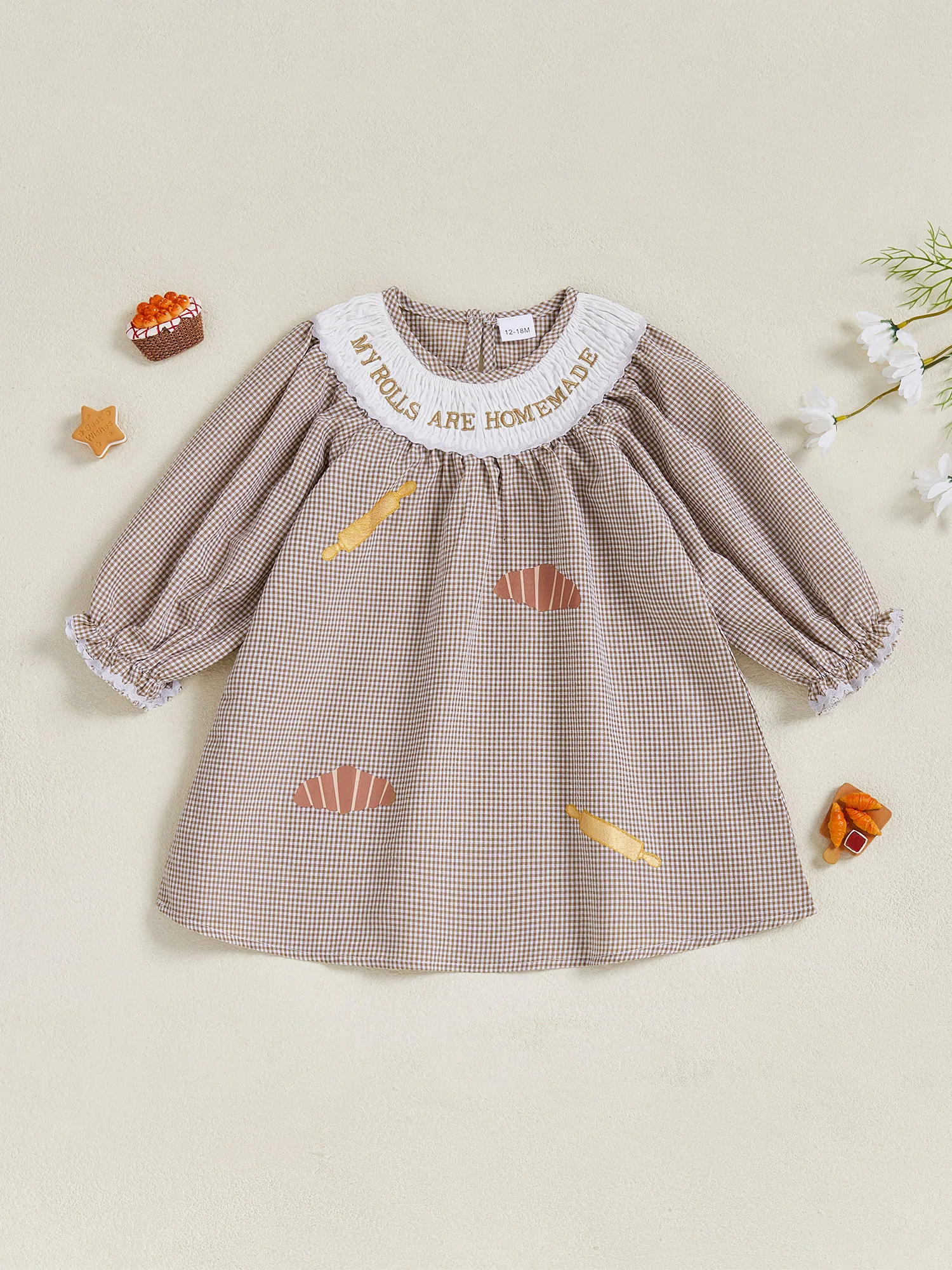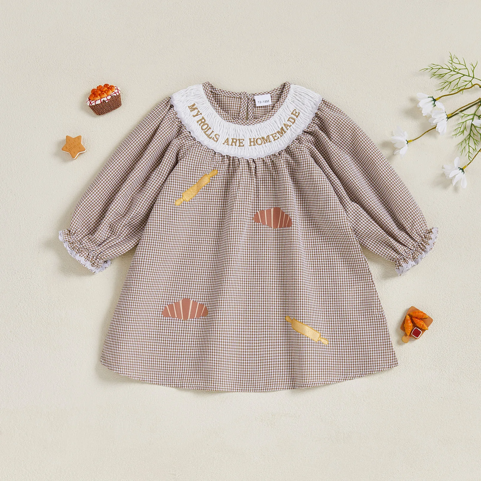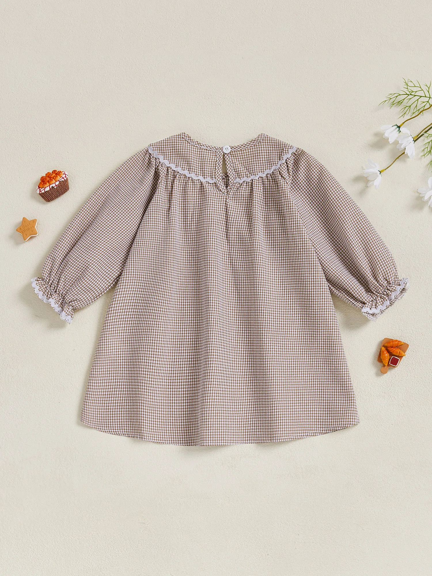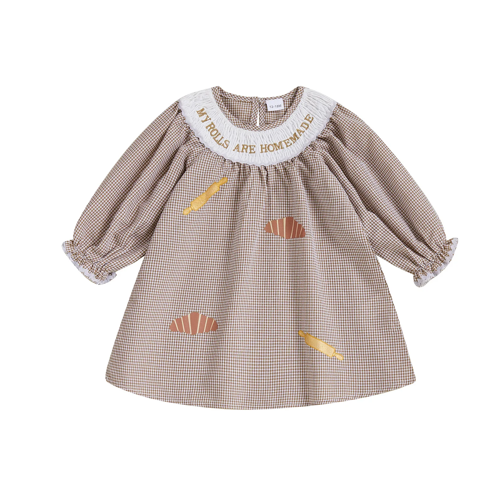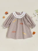 Little Girl Thanksgiving Plaid Dress Letter Bread Embroidered Round Neck Long Sleeve A-line Dress Cute Fall Clothes